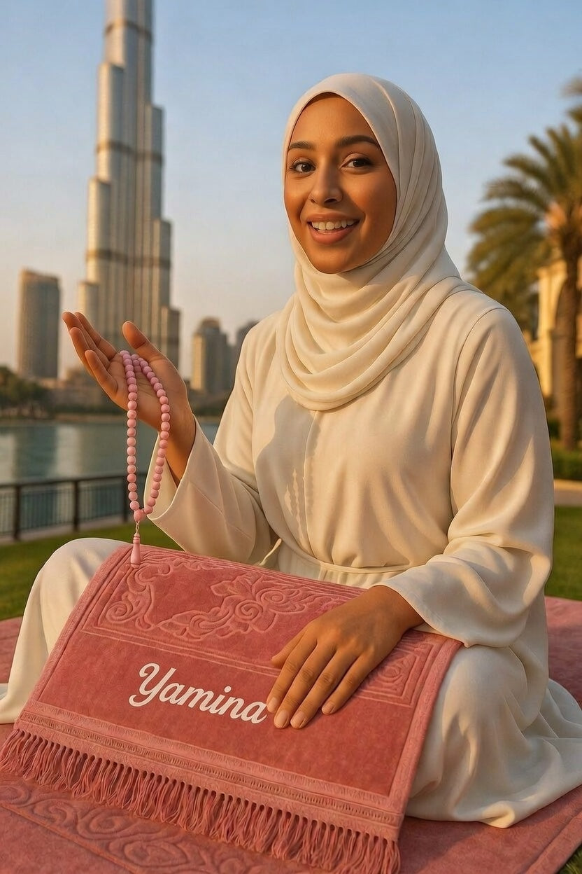 Commandez votre prénom brodé dès aujourd’hui et faites de ce tapis un compagnon précieux pour vos invocations. 🌸🕌